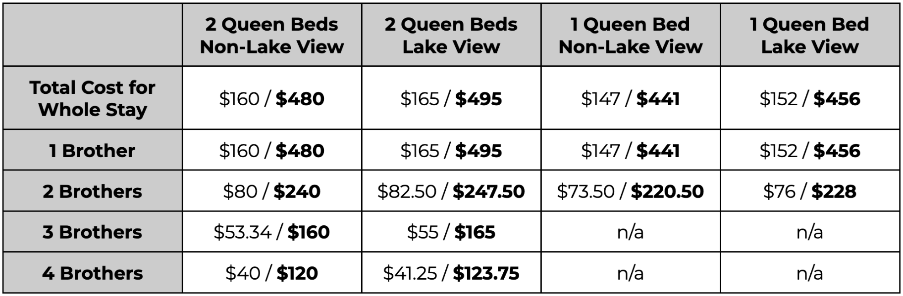 Cost Per Night / Full Cost Per Brother (before taxes)